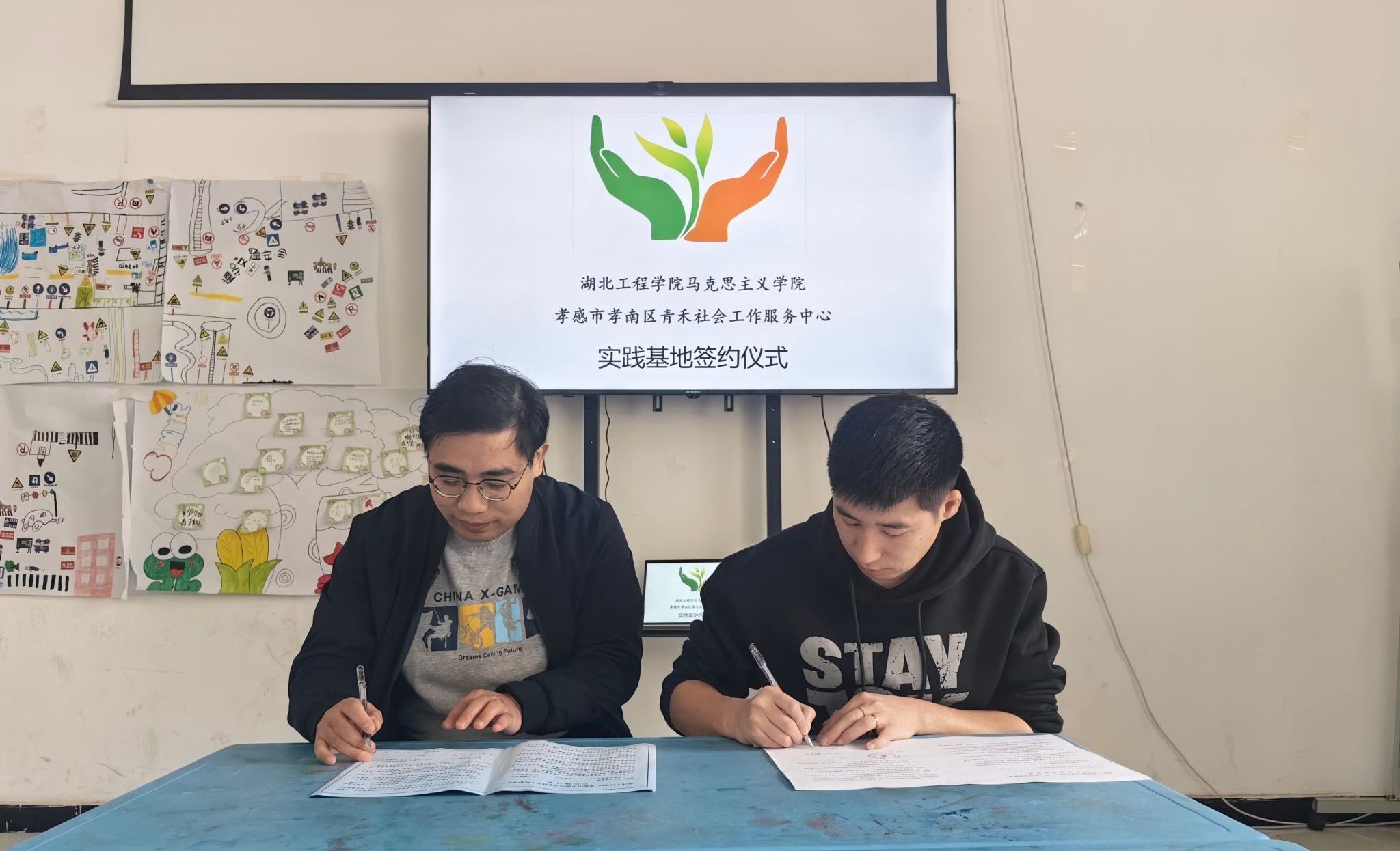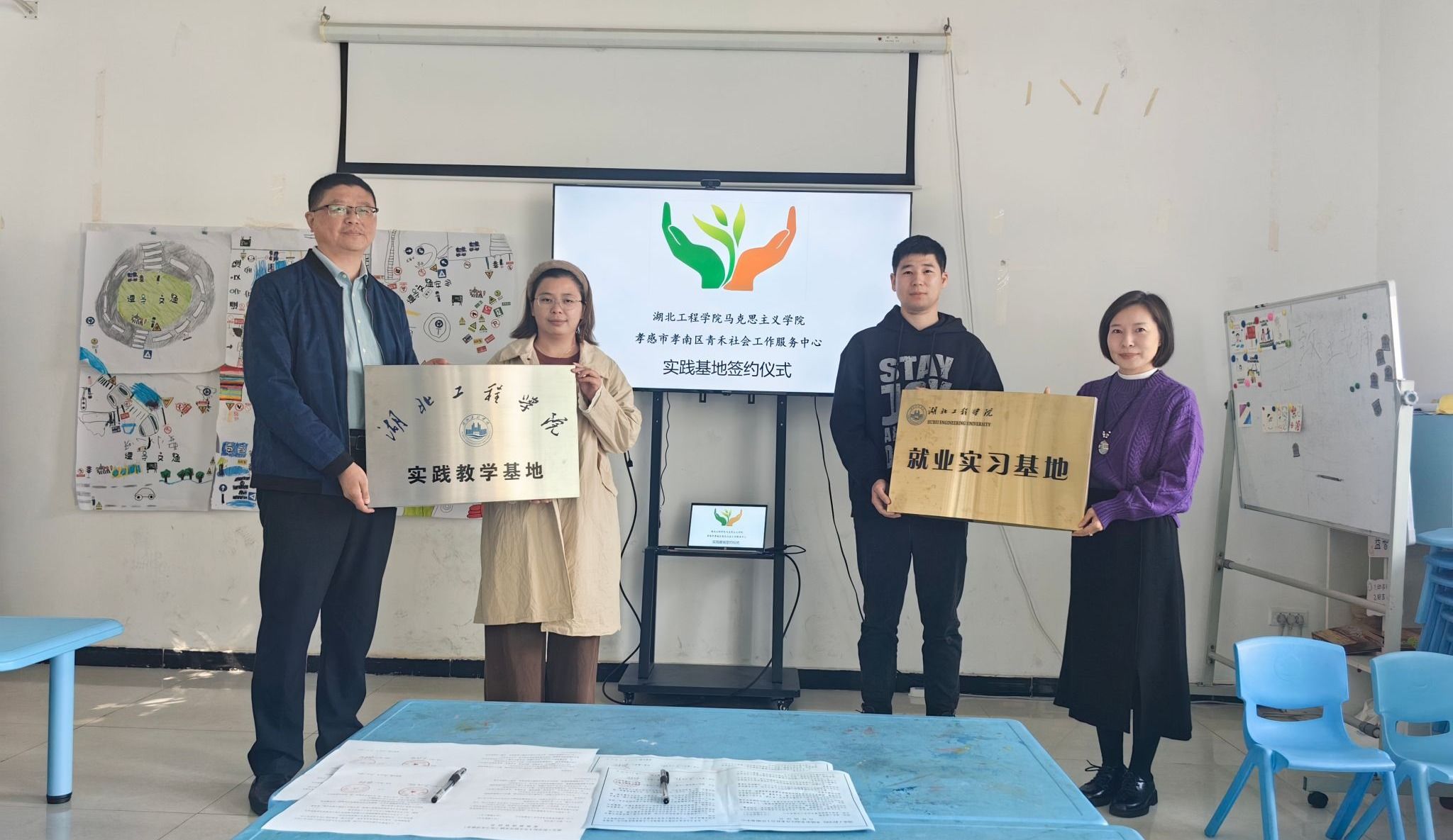 本网讯:10月14日上午,马克思主义学院副院长龚先砦、党委副书记魏伶俐、社工系主任王祖根、社工系支部书记王娟、辅导员席鹏飞一行五人,赴孝南区同升社区青禾社会工作服务中心,共同签订实习实训就业基地协议并举行挂牌仪式。