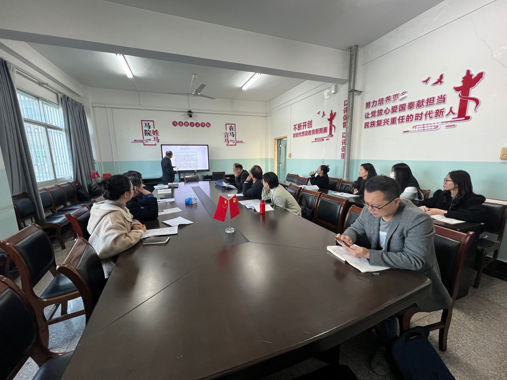 自由讨论环节,与会教师围绕“如何解决学生上课玩手机”这一普遍难题积极献言献策,老师们结合自身教学经验,提出了“始于沟通,建立契约”“精心设计课堂,提升吸引力”“化敌为友,将手机变为学习工具”等多元策略,强调通过增强课堂互动性、参与感和现实针对性,激发学生学习兴趣,引导学生从“被动听讲”转向“主动参与”。会议还传达了2025年秋季学期“提升行动”专家听课调研方案,部署了《概论》课期中考试安排。