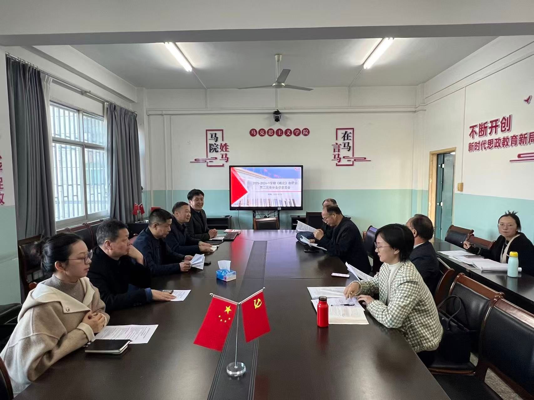本网讯:10月23日下午,在经法楼三楼小会议室,我院与新技术学院思政课教研室联合举行《毛泽东思想和中国特色社会主义理论体系概论》(以下简称《概论》)课集体备课交流会。马克思主义学院院长乐波、两院《概论》课教研室全体教师参会,会议由马克思主义学院思政课部主任章书俊主持。本次集体备课紧紧围绕“大中小学思政课一体化”建设要求,聚焦思政课教学中的共性难点与实际问题,特别是针对《学生常见问题清单》的梳理与教学应对策略展开深入研讨。