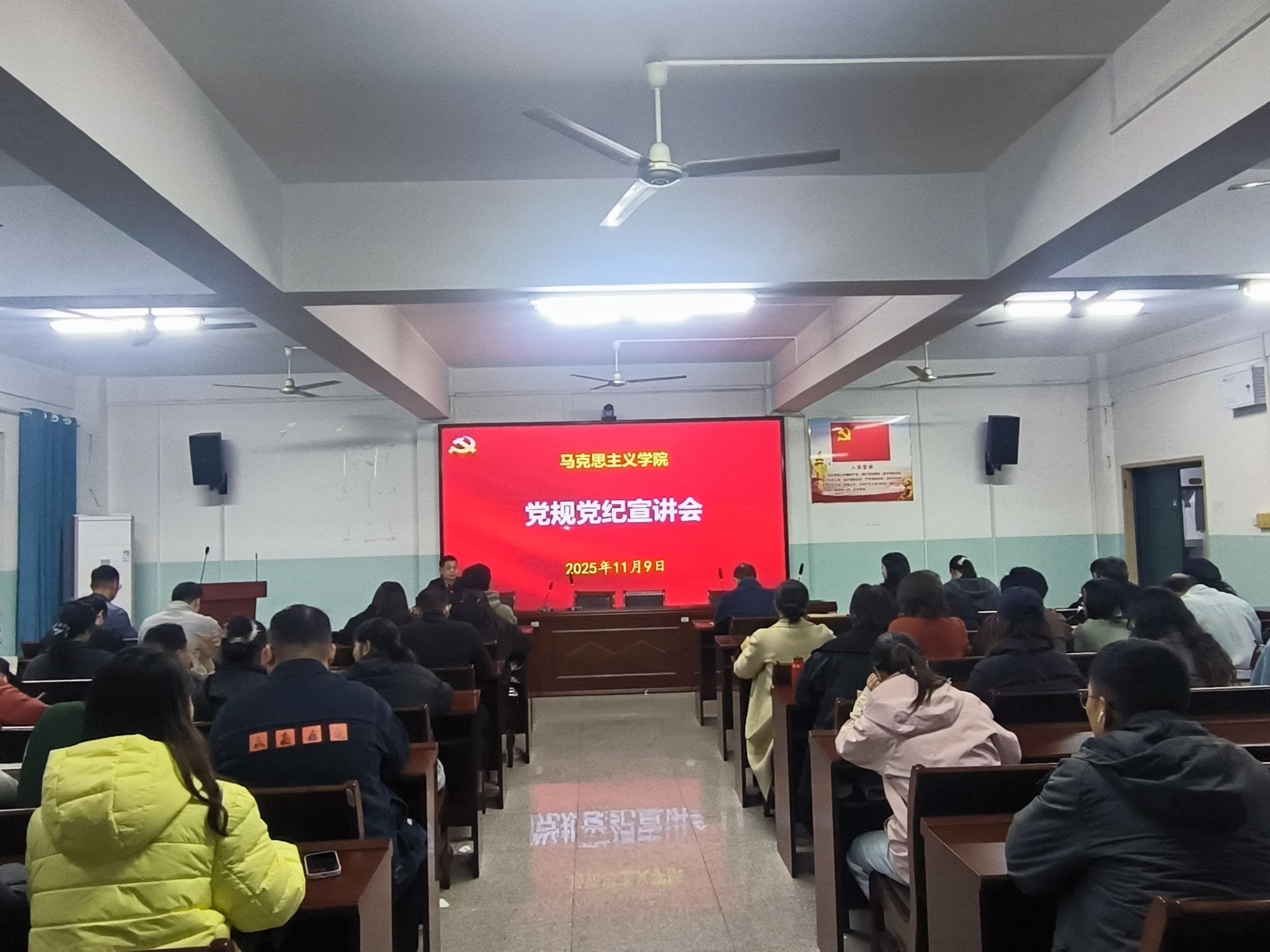 本网讯:11月9日晚,马克思主义学院召开师生党员大会,专题开展党规党纪宣讲及应知应会党规党纪知识测试工作。学院党委书记邓春晖主持会议,全体师生党员参会。会议结合党中央党纪学习教育部署和学院“主阵地”政治责任,围绕“严守党规党纪 筑牢育人根基”主题,从思想意义、纪律底线、实践要求三方面深入讲解。