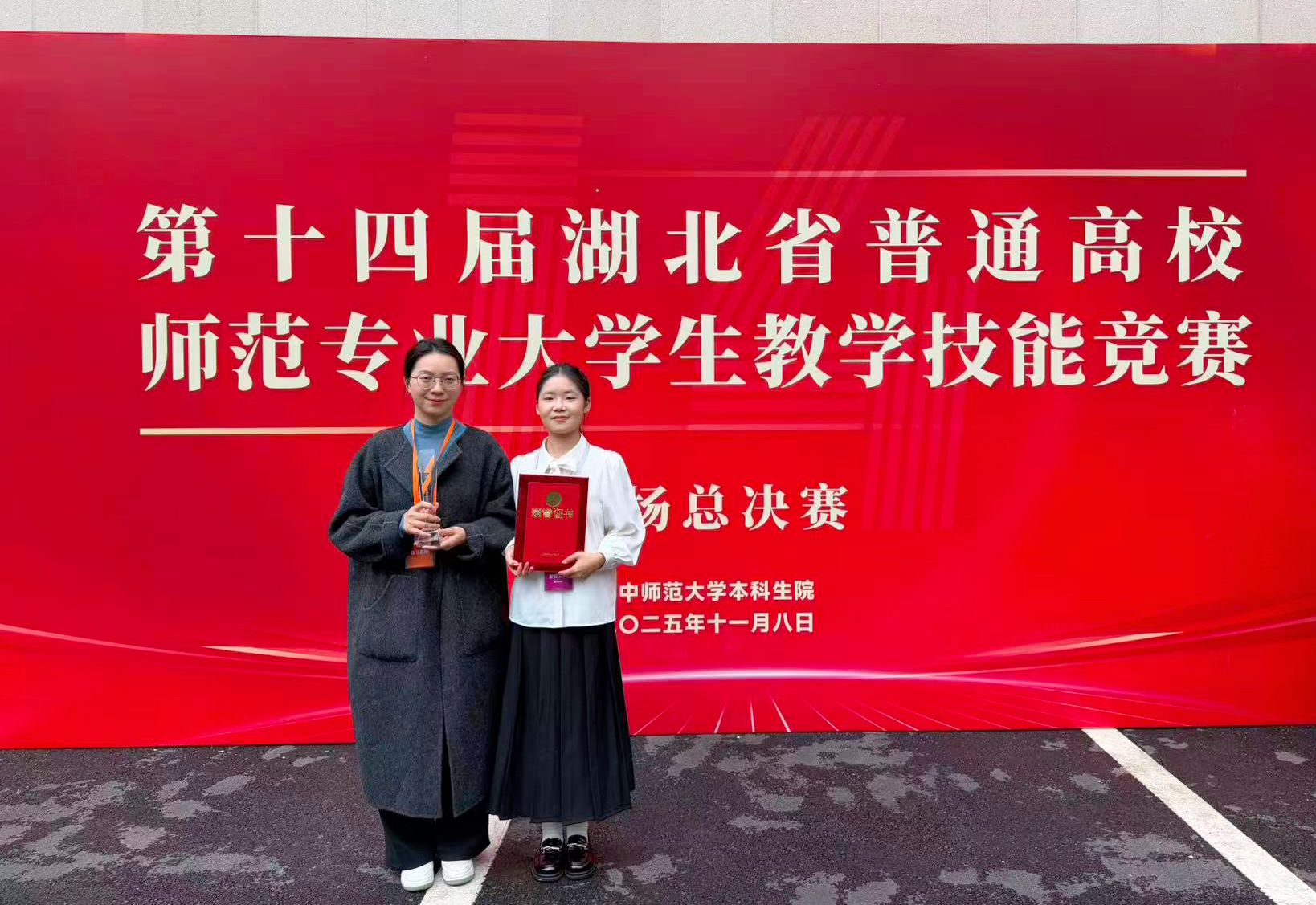 本网讯:11月8日,第十四届湖北省普通高校师范专业大学生教学技能竞赛现场总决赛在华中师范大学圆满落幕。由周鑫、殷海鸿和王菊丽三位老师共同指导的,我院思想政治教育专业学生向淑旎凭借扎实的教学基本功和出色的现场表现,荣获初中地理组二等奖,充分展现了学院思想政治教育专业人才培养的丰硕成果。