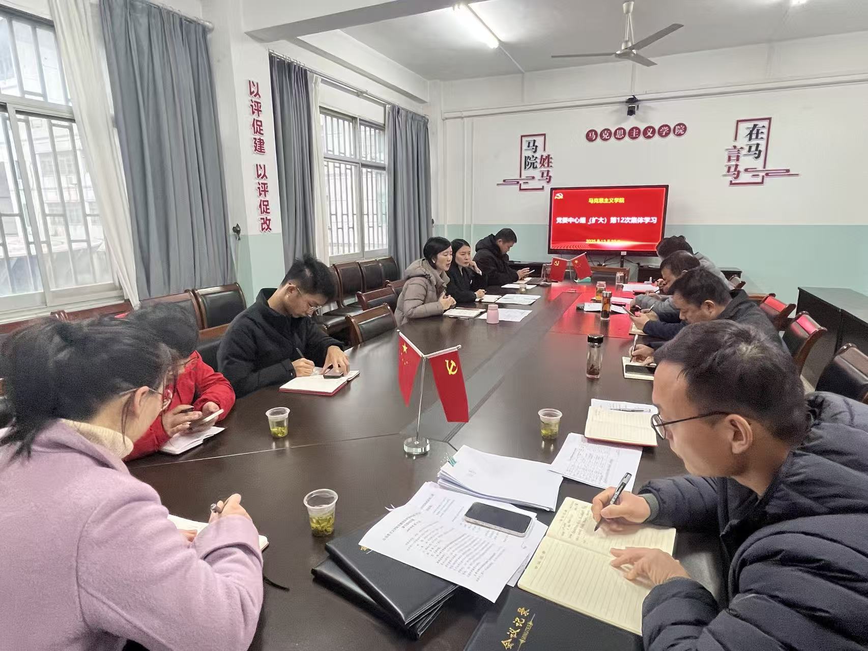 为深入学习贯彻习近平总书记重要讲话和指示批示精神,全面落实中央、省委及学校相关工作部署,切实将学习成果转化为推动学院高质量发展的实际成效,12月22日下午,马克思主义学院在经法楼316会议室举行党委中心组(扩大)第12次集体学习会。学院党委书记丁黎主持会议,学院领导班子成员、党委委员、部系主任及各支部书记参加会议。