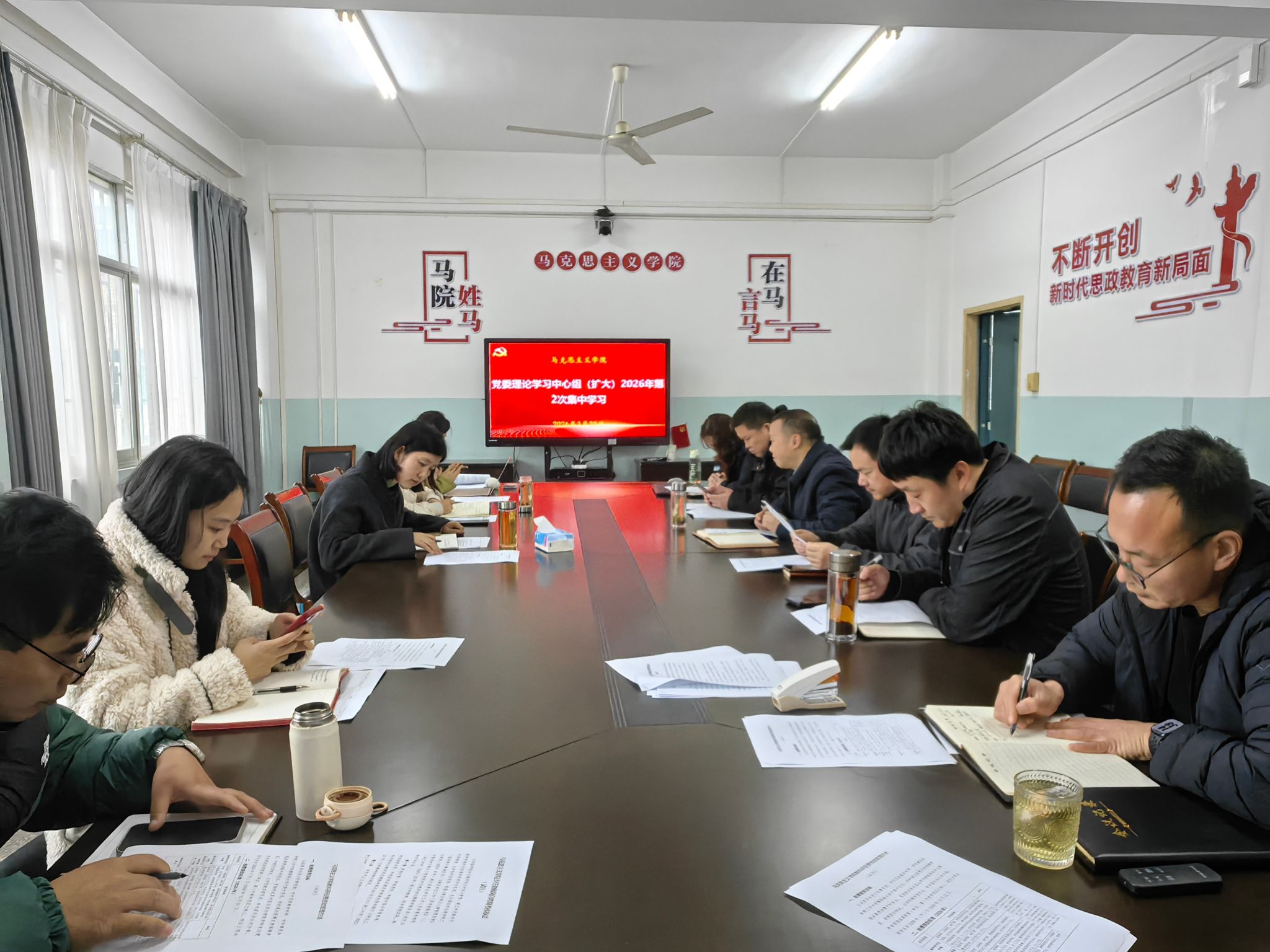 3月23日下午,学院2026年第2次党委理论学习中心组(扩大)集体学习会在经法楼316会议室召开,学院领导班子成员、党委委员、系部主任及各党支部书记参会,丁黎同志主持会议。