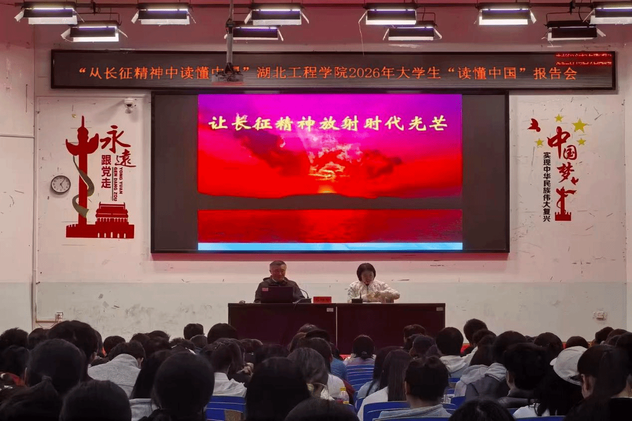 本网讯:4月23日下午,湖北工程学院2026年“读懂中国”活动首场报告会在经法楼报告厅举行。本次活动由学校关工委主办,学工部、校团委统筹组织,马克思主义学院承办。学校关工委“五老”代表、马克思主义学院原副院长杨振华老师担任主讲,来自各学院的学生代表共400余人参加报告会。